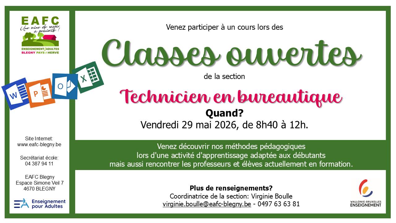 Nous ouvrons les portes de notre classe de technicien en bureautique le vendredi 29 mai 2026, de 8h40 à 12h :
